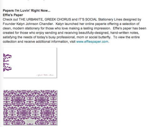 Check out THE URBANITE, GREEK CHORUS and IT’S SOCIAL Stationery Lines designed by Founder Kalyn Johnson Chandler. Kalyn launched her online paperie offering a selection of clean, modern stationery for those who love making a lasting impression. Effie’s paper has been created for those who enjoy sending and receiving beautifully-designed, hand-written notes, satisfying the needs of today’s busy professional, mom or social butterfly. To view the entire collection and receive additional information, visit www.effiespaper.com.